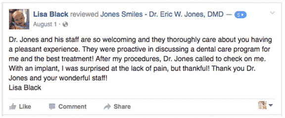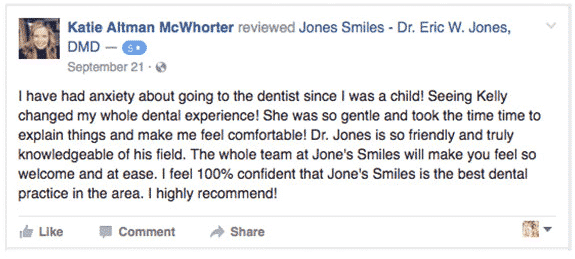 "I had not been to the dentist probably for 8 years prior to coming to Jones & Copeland Smiles. I am the patient that was crying in the car and did not want to come in these doors whatsoever. But once I came in here, the staff was so warm and friendly and Dr. Jones was very sincere...and he does wonderful sedation, which can get you through anything, any procedure you have whatsoever.